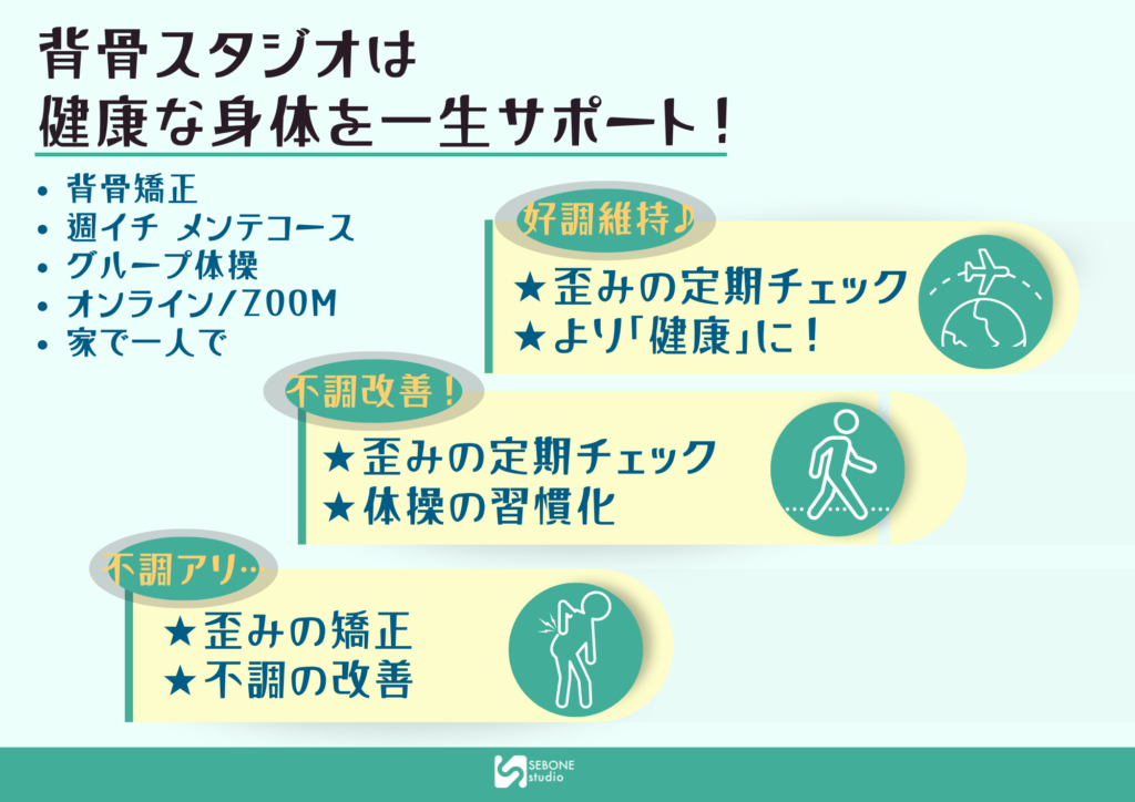 「背骨コンディショニング」「腰痛解決講座」「指導者養成講座」「食トレコンディショニング」は一般社団法人背骨コンディショニング協会®️認定のプログラム内容に基づいて実施され、同協会の認定資格保持者が担当いたします。詳細は協会HPをご覧ください。